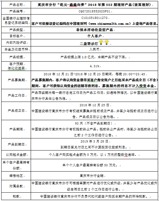 3.中国建设银行重庆市分行可根据市场情况等调整产品规模上、下限,并最迟于调整规模上下限当日进行公告。