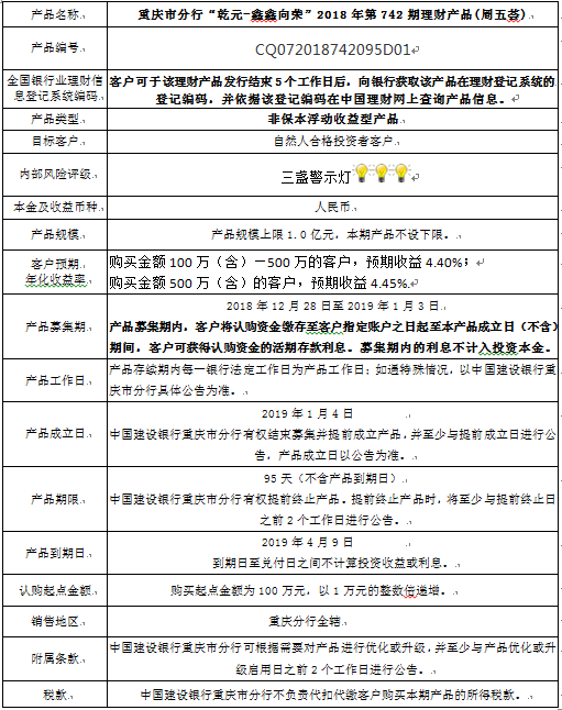 3.中国建设银行重庆市分行可根据市场情况等调整产品规模上、下限,并最迟于调整规模上下限当日进行公告。