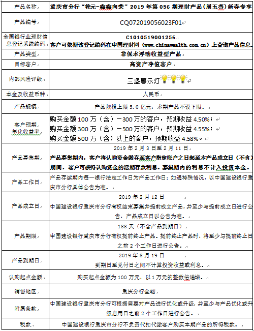 3.中国建设银行重庆市分行可根据市场情况等调整产品规模上、下限,并最迟于调整规模上下限当日进行公告。