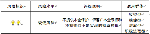 本产品为封闭式净值型理财产品,不保证本金和收益,请您充分认识投资风险,谨慎投资。本产品任何业绩比较基准、测算收益或类似表述均属不具有法律约束力的用语,不代表客户可能获得的实际收益,亦不构成中国建设银行重庆市分行对本产品的任何收益承诺。产品期限为固定期限(中国建设银行重庆市分行有权提前终止产品),存续期内产品不接受赎回申请。 本期产品内部风险评级级别为二盏警示灯 ,风险程度属于较低风险,适用于收益型、稳健型、进取型和积极进取型客户。最不利情况下,本期产品投资的资产无法回收任何本金和净收益,客户将损失全部本金。投资者不得使用贷款、发行债券等筹集的非自有资金投资本产品。如影响您风险承受能力的因素发生变化,请及时完成风险承受能力评估。