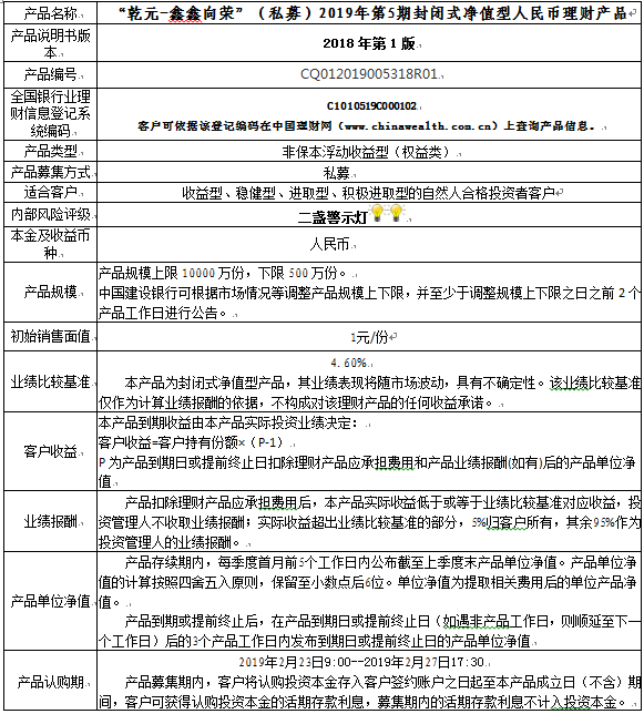 中国建设银行重庆市分行“乾元-鑫鑫向荣”(私募)2019年