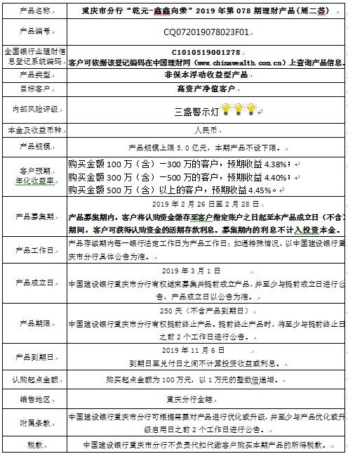 3.中国建设银行重庆市分行可根据市场情况等调整产品规模上、下限,并最迟于调整规模上下限当日进行公告。