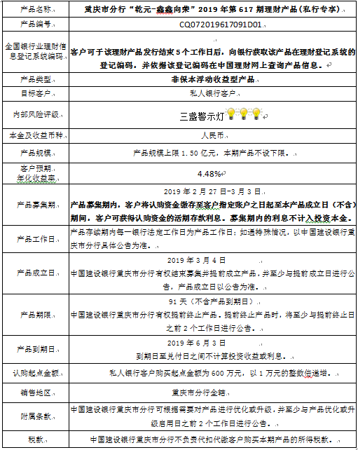 3.中国建设银行重庆市分行可根据市场情况等调整产品规模上、下限,并最迟于调整规模上下限当日进行公告。