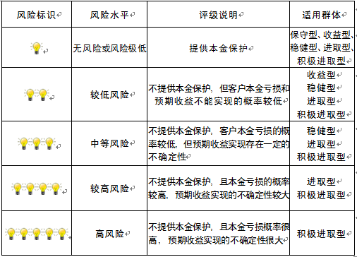 本产品为非保本浮动收益型理财产品,不保证本金和收益,请您充分认识投资风险,谨慎投资。本期产品期限为250天(中国建设银行有权对产品进行展期或提前终止),存续期内,产品不接受申购或赎回申请。本期产品内部风险评级级别为三盏警示灯,风险水平属于中等风险。最不利情况下,您将损失全部收益甚至包括全部本金。本理财产品适用于稳健型、进取型 、积极进取型客户。