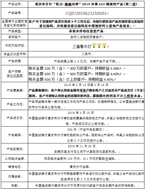 1.本期产品规模上限:3.0亿元。在本期产品募集期内,对本期产品的认购金额达到本期理财产品规模上限,则中国建设银行重庆市分行有权利但无义务停止本期产品的认购,已经认购成功的客户投资权益不受影响。