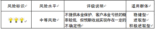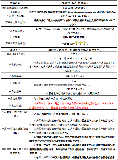 本产品为非保本浮动收益型理财产品,不保证本金和收益,请您充分认识投资风险,谨慎投资。产品期限为5年(中国建设银行重庆市分行有权调整产品期限),产品存续期内任一产品工作日的指定时段均可接受申购/追加投资/赎回申请(超过单个客户累计赎回限额的赎回申请除外、巨额赎回时请以公告为准)。产品内部风险评级级别为三盏警示灯,风险水平为中等风险。最不利情况下,基础资产无法回收任何本金和收益,客户将损失全部本金。产品适合于稳健型、进取型及积极进取型客户。
