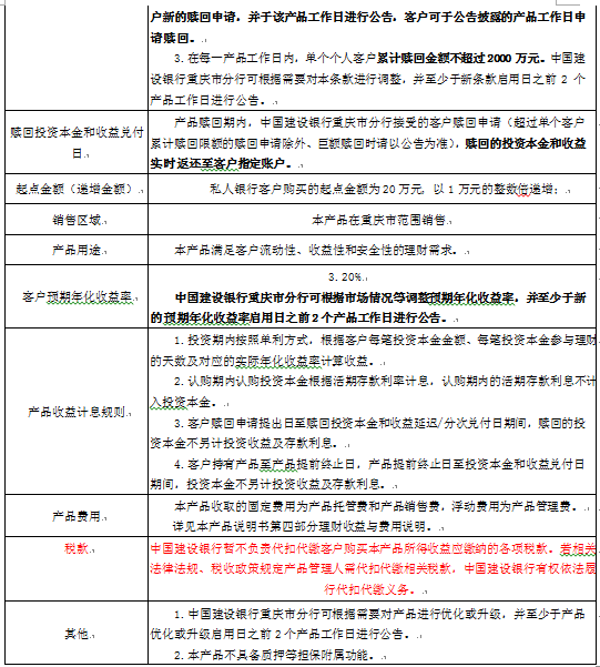 3.中国建设银行重庆市分行可根据市场和产品运行情况等调整产品存续期规模上下限,并至少于调整规模上下限之日之前2个产品工作日进行公告。
