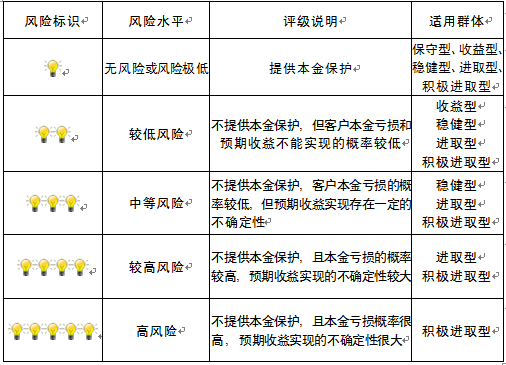 本产品为非保本浮动收益型理财产品,不保证本金和收益,请您充分认识投资风险,谨慎投资。本期产品期限为122天(中国建设银行有权对产品进行展期或提前终止),存续期内,产品不接受申购或赎回申请。本期产品内部风险评级级别为三盏警示灯,风险水平属于中等风险。最不利情况下,您将损失全部收益甚至包括全部本金。本理财产品适用于稳健型、进取型 、积极进取型客户。