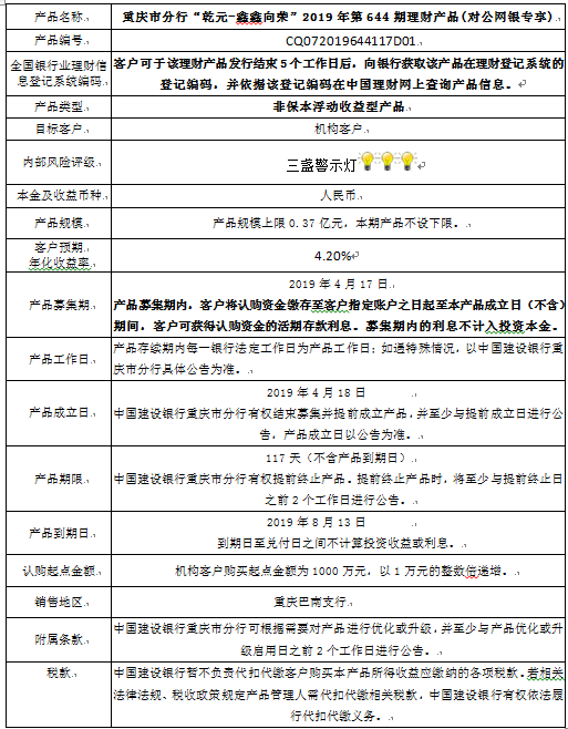 1.本期产品规模上限:0.37亿元。在本期产品募集期内,对本期产品的认购金额达到本期理财产品规模上限,则中国建设银行重庆市分行有权利但无义务停止本期产品的认购,已经认购成功的客户投资权益不受影响。