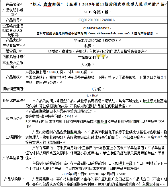 中国建设银行重庆市分行“乾元-鑫鑫向荣”(私募)2019年