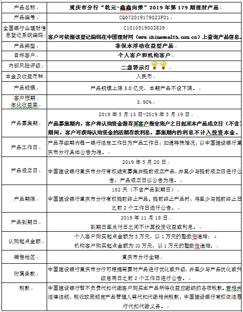 本产品为非保本浮动收益型理财产品,不保证本金和收益,请您充分认识投资风险,谨慎投资。本期产品期限为182天(中国建设银行有权对产品进行展期或提前终止),存续期内,产品不接受申购或赎回申请。本期产品内部风险评级级别为二盏警示灯 ,风险水平属于较低风险。最不利情况下,您将损失全部收益甚至包括全部本金。本理财产品适用于收益型、稳健型、进取型 、积极进取型客户。