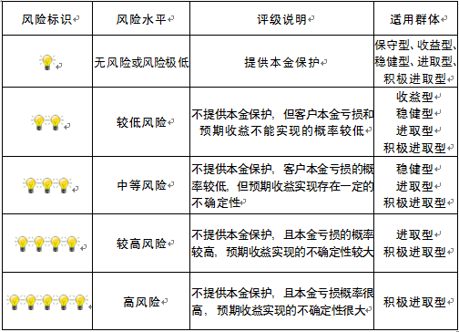 本产品为非保本浮动收益型理财产品,不保证本金和收益,请您充分认识投资风险,谨慎投资。本期产品期限为135天(中国建设银行有权对产品进行展期或提前终止),存续期内,产品不接受申购或赎回申请。本期产品内部风险评级级别为三盏警示灯 ,风险水平属于中等风险。最不利情况下,您将损失全部收益甚至包括全部本金。本理财产品适用于稳健型、进取型 、积极进取型客户。
