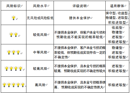 本产品为非保本浮动收益型理财产品,不保证本金和收益,请您充分认识投资风险,谨慎投资。本期产品期限为109天(中国建设银行有权对产品进行展期或提前终止),存续期内,产品不接受申购或赎回申请。本期产品内部风险评级级别为二盏警示灯 ,风险水平属于较低风险。最不利情况下,您将损失全部收益甚至包括全部本金。本理财产品适用于收益型、稳健型、进取型 、积极进取型客户。