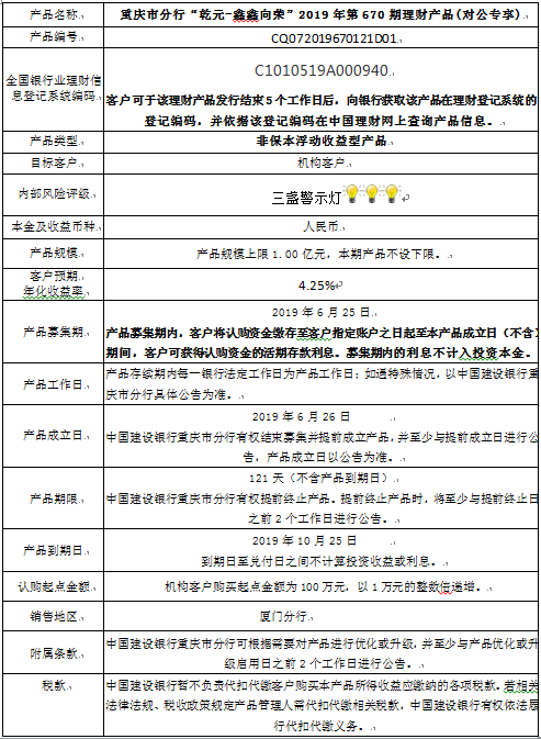 3.中国建设银行重庆市分行可根据市场情况等调整产品规模上、下限,并最迟于调整规模上下限当日进行公告。