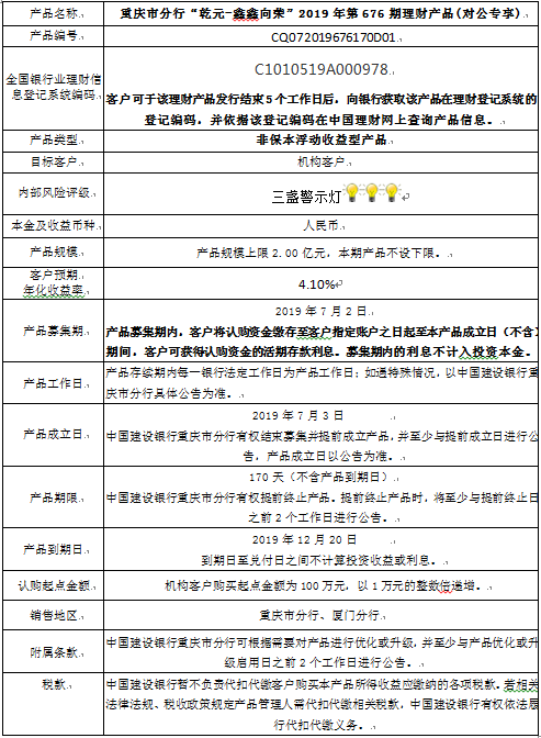 1.本期产品规模上限:2.00亿元。在本期产品募集期内,对本期产品的认购金额达到本期理财产品规模上限,则中国建设银行重庆市分行有权利但无义务停止本期产品的认购,已经认购成功的客户投资权益不受影响。