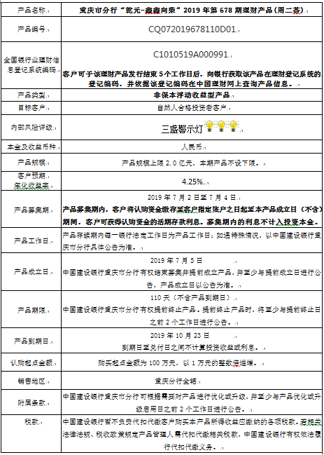 3.中国建设银行重庆市分行可根据市场情况等调整产品规模上、下限,并最迟于调整规模上下限当日进行公告。
