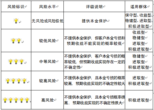 本产品为非保本浮动收益型理财产品,不保证本金和收益,请您充分认识投资风险,谨慎投资。本期产品期限为124天(中国建设银行有权对产品进行展期或提前终止),存续期内,产品不接受申购或赎回申请。本期产品内部风险评级级别为三盏警示灯,风险水平属于中等风险。最不利情况下,您将损失全部收益甚至包括全部本金。本理财产品适用于稳健型、进取型 、积极进取型客户。