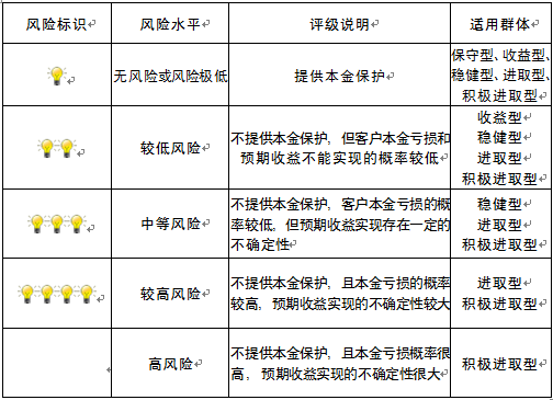 本产品为非保本浮动收益型理财产品,不保证本金和收益,请您充分认识投资风险,谨慎投资。本期产品期限为140天(中国建设银行有权对产品进行展期或提前终止),存续期内,产品不接受申购或赎回申请。本期产品内部风险评级级别为三盏警示灯 ,风险水平属于中等风险。最不利情况下,您将损失全部收益甚至包括全部本金。本理财产品适用于稳健型、进取型 、积极进取型客户。