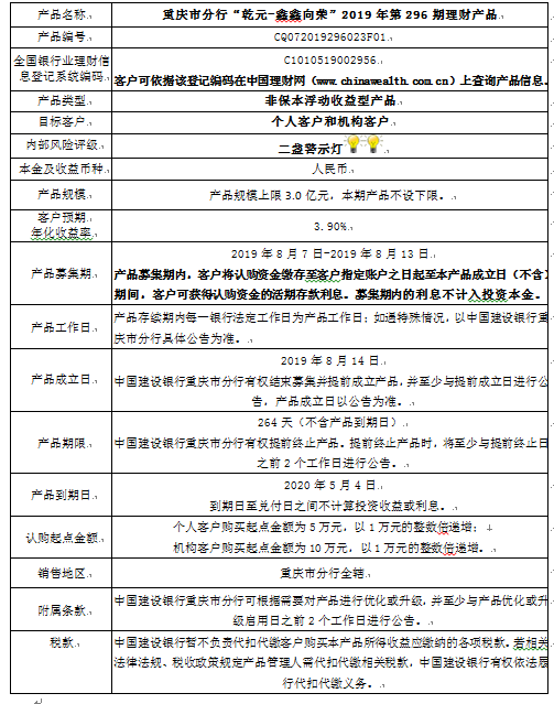 3.中国建设银行重庆市分行可根据市场情况等调整产品规模上、下限,并最迟于调整规模上下限当日进行公告。