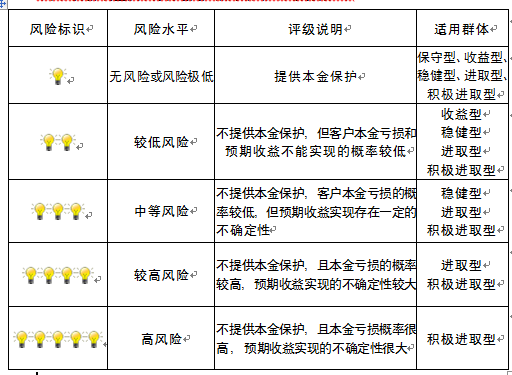 本产品为非保本浮动收益型理财产品,不保证本金和收益,请您充分认识投资风险,谨慎投资。本期产品期限为182天(中国建设银行有权对产品进行展期或提前终止),存续期内,产品不接受申购或赎回申请。本期产品内部风险评级级别为二盏警示灯 ,风险水平属于较低风险。最不利情况下,您将损失全部收益甚至包括全部本金。本理财产品适用于收益型、稳健型、进取型 、积极进取型客户。