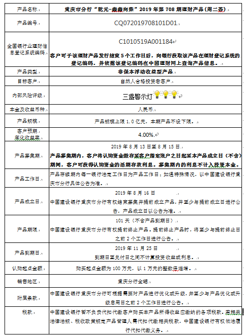 3.中国建设银行重庆市分行可根据市场情况等调整产品规模上、下限,并最迟于调整规模上下限当日进行公告。