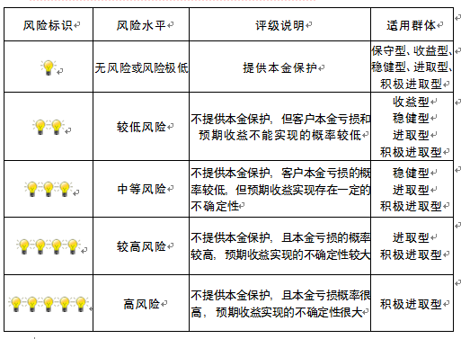 本产品为非保本浮动收益型理财产品,不保证本金和收益,请您充分认识投资风险,谨慎投资。本期产品期限为103天(中国建设银行有权对产品进行展期或提前终止),存续期内,产品不接受申购或赎回申请。本期产品内部风险评级级别为二盏警示灯 ,风险水平属于较低风险。最不利情况下,您将损失全部收益甚至包括全部本金。本理财产品适用于收益型、稳健型、进取型 、积极进取型客户。