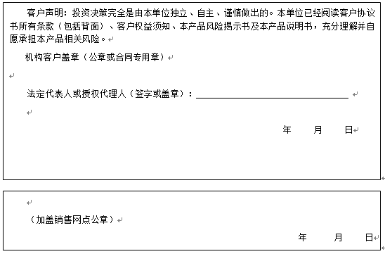 客户签名: ( 客户声明:投资决策完全是由客户独立、自主、谨慎做出的。客户已经阅读客户协议书所有条款(包括背面)、客户权益须知、本产品风险揭示书及本产品说明书,充分理解并自愿承担本产品相关风险。)