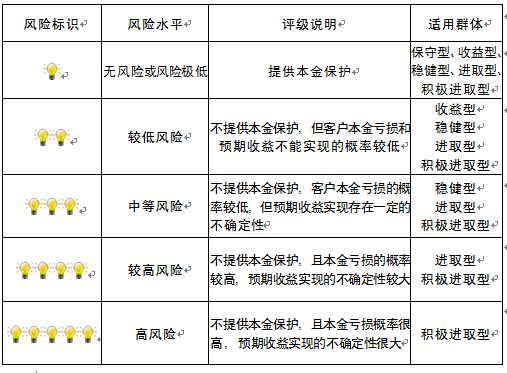 本产品为非保本浮动收益型理财产品,不保证本金和收益,请您充分认识投资风险,谨慎投资。本期产品期限为360天(中国建设银行有权对产品进行展期或提前终止),存续期内,产品不接受申购或赎回申请。本期产品内部风险评级级别为二盏警示灯 ,风险水平属于较低风险。最不利情况下,您将损失全部收益甚至包括全部本金。本理财产品适用于收益型、稳健型、进取型 、积极进取型客户。
