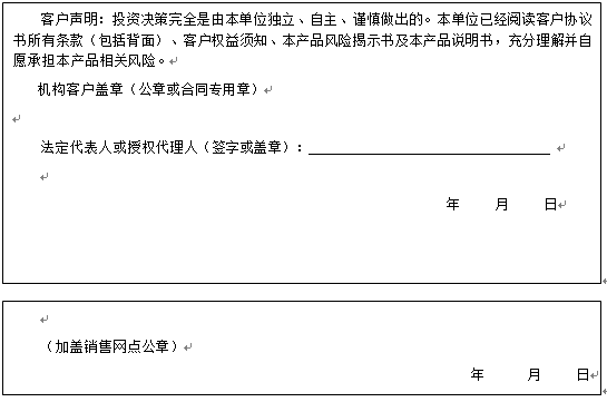 客户签名: ( 客户声明:投资决策完全是由客户独立、自主、谨慎做出的。客户已经阅读客户协议书所有条款(包括背面)、客户权益须知、本产品风险揭示书及本产品说明书,充分理解并自愿承担本产品相关风险。)
