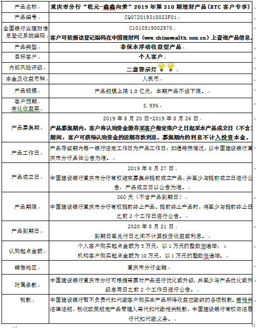 3.中国建设银行重庆市分行可根据市场情况等调整产品规模上、下限,并最迟于调整规模上下限当日进行公告。