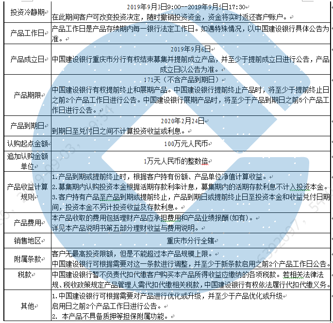 (一)中国建设银行重庆市分行通过中国建设银行网站(www.ccb.com)披露产品以下相关信息:在产品正常成立、产品终止、发生对产品产生重大影响之情形后的5个产品工作日内发布产品成立、产品终止、重大影响事件等信息;如中国建设银行拟调整产品规模上下限、调整业绩比较基准、调整投资范围、投资品种或投资比例、优化或升级产品、行使提前终止权,则需在调整规模上下限之日、新的业绩比较基准启用日、新的投资范围、投资品种或投资比例启用日、产品优化或升级启用日、提前终止日等相关日之前至少2个产品工作日进行公告;如中国建设银行拟调整本产品相关费用费率或延长产品期限,则需在费用费率调整日或产品到期日之前至少5个产品工作日进行公告;如发生产品到期时的延迟/分次兑付情形,则于该情形发生后的2个产品工作日内进行公告;产品存续期内,每季度首月前5个工作日内公布截至上季度末产品的资产净值、份额净值和其他重要信息;产品到期或提前终止后,在产品到期日或提前终止日(如遇非产品工作日,则顺延至下一个工作日)后的3个产品工作日内发布到期日或提前终止日的产品资产净值、份额净值和其他重要信息。