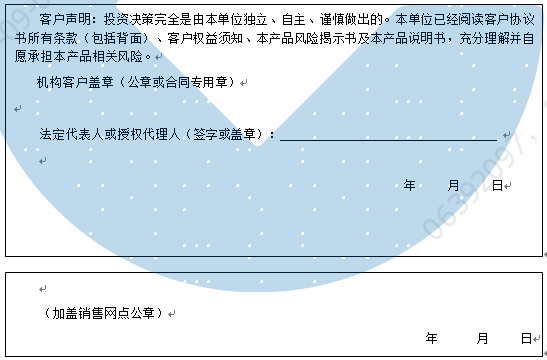客户签名: ( 客户声明:投资决策完全是由客户独立、自主、谨慎做出的。客户已经阅读客户协议书所有条款(包括背面)、客户权益须知、本产品风险揭示书及本产品说明书,充分理解并自愿承担本产品相关风险。)