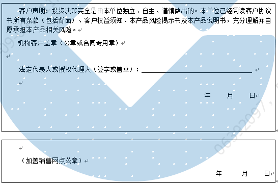 客户签名: ( 客户声明:投资决策完全是由客户独立、自主、谨慎做出的。客户已经阅读客户协议书所有条款(包括背面)、客户权益须知、本产品风险揭示书及本产品说明书,充分理解并自愿承担本产品相关风险。)