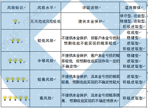 本产品为非保本浮动收益型理财产品,不保证本金和收益,请您充分认识投资风险,谨慎投资。本期产品期限为91天(中国建设银行有权对产品进行展期或提前终止),存续期内,产品不接受申购或赎回申请。本期产品内部风险评级级别为二盏警示灯 ,风险水平属于较低风险。最不利情况下,您将损失全部收益甚至包括全部本金。本理财产品适用于收益型、稳健型、进取型 、积极进取型客户。