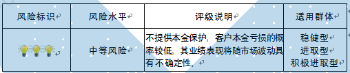 本产品为封闭式净值型理财产品,不保证本金和收益,请您充分认识投资风险,谨慎投资。本产品任何业绩比较基准、测算收益或类似表述均属不具有法律约束力的用语,不代表客户可能获得的实际收益,亦不构成中国建设银行重庆市分行对本产品的任何收益承诺。产品期限为固定期限(中国建设银行重庆市分行有权提前终止产品),存续期内产品不接受赎回申请。 本期产品内部风险评级级别为三盏警示灯 ,风险程度属于中等风险,适用于稳健型、进取型和积极进取型客户。最不利情况下,本期产品投资的资产无法回收任何本金和净收益,客户将损失全部本金。投资者不得使用贷款、发行债券等筹集的非自有资金投资本产品。如影响您风险承受能力的因素发生变化,请及时完成风险承受能力评估。