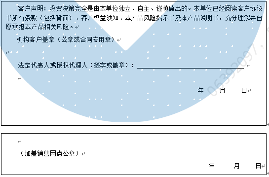 客户签名: ( 客户声明:投资决策完全是由客户独立、自主、谨慎做出的。客户已经阅读客户协议书所有条款(包括背面)、客户权益须知、本产品风险揭示书及本产品说明书,充分理解并自愿承担本产品相关风险。)