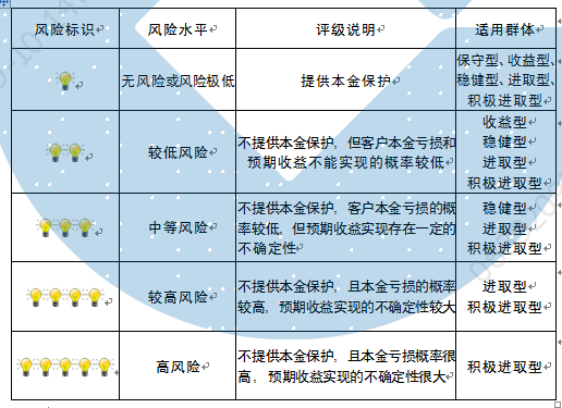 本产品为非保本浮动收益型理财产品,不保证本金和收益,请您充分认识投资风险,谨慎投资。本期产品期限为300天(中国建设银行有权对产品进行展期或提前终止),存续期内,产品不接受申购或赎回申请。本期产品内部风险评级级别为三盏警示灯 ,风险水平属于中等风险。最不利情况下,您将损失全部收益甚至包括全部本金。本理财产品适用于稳健型、进取型 、积极进取型客户。