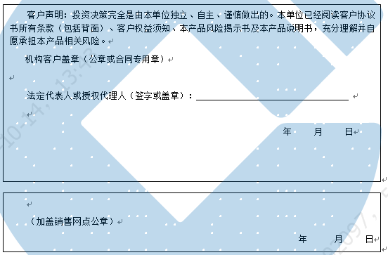 客户签名: ( 客户声明:投资决策完全是由客户独立、自主、谨慎做出的。客户已经阅读客户协议书所有条款(包括背面)、客户权益须知、本产品风险揭示书及本产品说明书,充分理解并自愿承担本产品相关风险。)