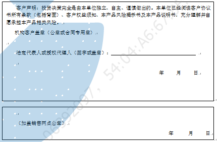 客户签名: ( 客户声明:投资决策完全是由客户独立、自主、谨慎做出的。客户已经阅读客户协议书所有条款(包括背面)、客户权益须知、本产品风险揭示书及本产品说明书,充分理解并自愿承担本产品相关风险。)