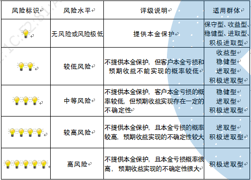 本产品为非保本浮动收益型理财产品,不保证本金和收益,请您充分认识投资风险,谨慎投资。本期产品期限为125天(中国建设银行有权对产品进行展期或提前终止),存续期内,产品不接受申购或赎回申请。本期产品内部风险评级级别为二盏警示灯 ,风险水平属于较低风险。最不利情况下,您将损失全部收益甚至包括全部本金。本理财产品适用于收益型、稳健型、进取型 、积极进取型客户。
