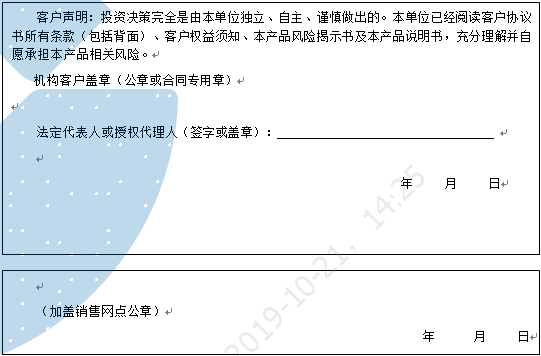 客户签名: ( 客户声明:投资决策完全是由客户独立、自主、谨慎做出的。客户已经阅读客户协议书所有条款(包括背面)、客户权益须知、本产品风险揭示书及本产品说明书,充分理解并自愿承担本产品相关风险。)