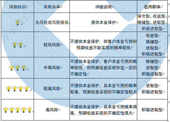 本产品为非保本浮动收益型理财产品,不保证本金和收益,请您充分认识投资风险,谨慎投资。本期产品期限为96天(中国建设银行有权对产品进行展期或提前终止),存续期内,产品不接受申购或赎回申请。本期产品内部风险评级级别为三盏警示灯 ,风险水平属于中等风险。最不利情况下,您将损失全部收益甚至包括全部本金。本理财产品适用于稳健型、进取型 、积极进取型客户。
