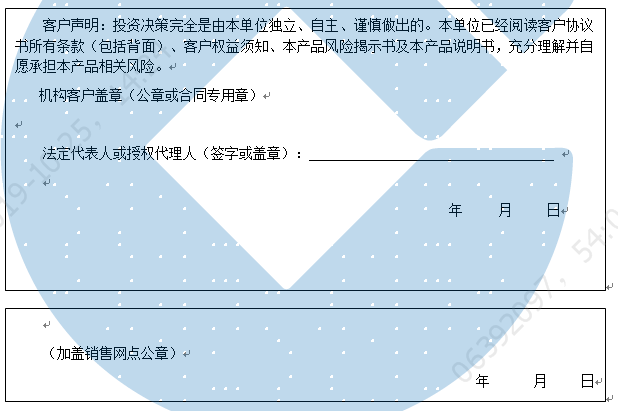 客户签名: ( 客户声明:投资决策完全是由客户独立、自主、谨慎做出的。客户已经阅读客户协议书所有条款(包括背面)、客户权益须知、本产品风险揭示书及本产品说明书,充分理解并自愿承担本产品相关风险。)