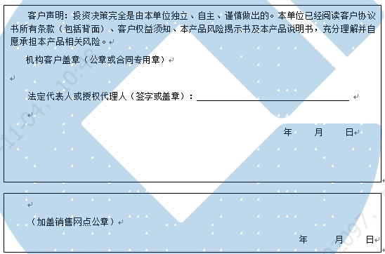 客户签名: ( 客户声明:投资决策完全是由客户独立、自主、谨慎做出的。客户已经阅读客户协议书所有条款(包括背面)、客户权益须知、本产品风险揭示书及本产品说明书,充分理解并自愿承担本产品相关风险。)