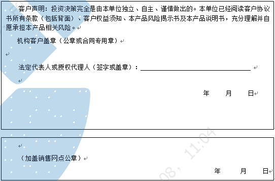 客户签名: ( 客户声明:投资决策完全是由客户独立、自主、谨慎做出的。客户已经阅读客户协议书所有条款(包括背面)、客户权益须知、本产品风险揭示书及本产品说明书,充分理解并自愿承担本产品相关风险。)