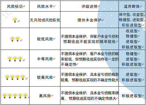 本产品为非保本浮动收益型理财产品,不保证本金和收益,请您充分认识投资风险,谨慎投资。本期产品期限为180天(中国建设银行有权对产品进行展期或提前终止),存续期内,产品不接受申购或赎回申请。本期产品内部风险评级级别为三盏警示灯,风险水平属于中等风险。最不利情况下,您将损失全部收益甚至包括全部本金。本理财产品适用于稳健型、进取型 、积极进取型客户。