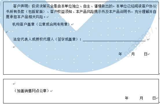 客户签名: ( 客户声明:投资决策完全是由客户独立、自主、谨慎做出的。客户已经阅读客户协议书所有条款(包括背面)、客户权益须知、本产品风险揭示书及本产品说明书,充分理解并自愿承担本产品相关风险。)