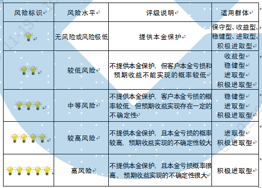 本产品为非保本浮动收益型理财产品,不保证本金和收益,请您充分认识投资风险,谨慎投资。本期产品期限为127天(中国建设银行有权对产品进行展期或提前终止),存续期内,产品不接受申购或赎回申请。本期产品内部风险评级级别为三盏警示灯 ,风险水平属于中等风险。最不利情况下,您将损失全部收益甚至包括全部本金。本理财产品适用于稳健型、进取型 、积极进取型客户。