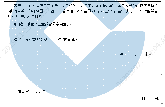 客户签名: ( 客户声明:投资决策完全是由客户独立、自主、谨慎做出的。客户已经阅读客户协议书所有条款(包括背面)、客户权益须知、本产品风险揭示书及本产品说明书,充分理解并自愿承担本产品相关风险。)