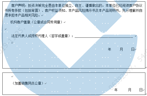 客户签名: ( 客户声明:投资决策完全是由客户独立、自主、谨慎做出的。客户已经阅读客户协议书所有条款(包括背面)、客户权益须知、本产品风险揭示书及本产品说明书,充分理解并自愿承担本产品相关风险。)